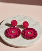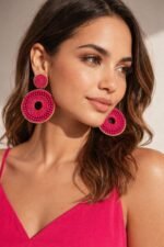 The bright fuchsia tone adds a lively pop of color, making her outfit feel fresh and fashion-forward. Whether paired with a simple white dress, a festive saree, or a chic co-ord set, these earrings become the highlight of her style — bold, feminine, and full of personality.