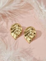Make a statement with these stunning gold leaf stud earrings, inspired by the natural beauty of tropical foliage. Featuring a sculpted leaf design with intricate vein detailing, these earrings reflect light beautifully and add a touch of elegance to any outfit. Their bold yet timeless look makes them perfect for both everyday wear and special occasions.