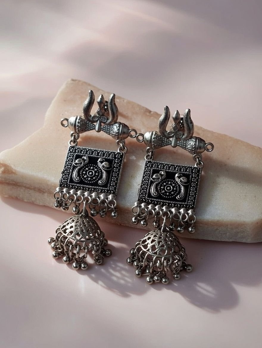 Designed with a classic antique silver oxidised finish, they offer a bold yet meaningful statement. Perfect for festive occasions, temple visits, cultural events, or adding a spiritual touch to your everyday ethnic look.